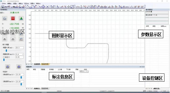 系統界面主要包括:菜單、工具欄、狀態欄、圖形顯示區(輪廓及粗糙度視圖)、標注信息區(輪廓標注及粗糙度參數列表)、系統參數顯示區、設備控制區。