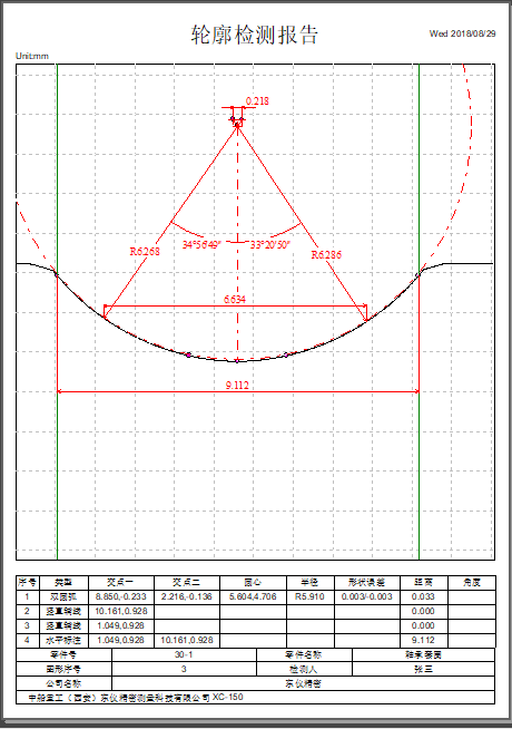 零件測量、標注及參數評定完成后,可以將檢測結果打印出來。用戶通過打印信息設置對話框輸入檢測報告打印信息(零件名稱、零件號、檢測人、公司名稱等)以及選擇格式輸出選項(輪廓/粗糙度圖形、輪廓標注信息列表、粗糙度評定參數列表),查看打印預覽結果即為打印結果,如圖所示。